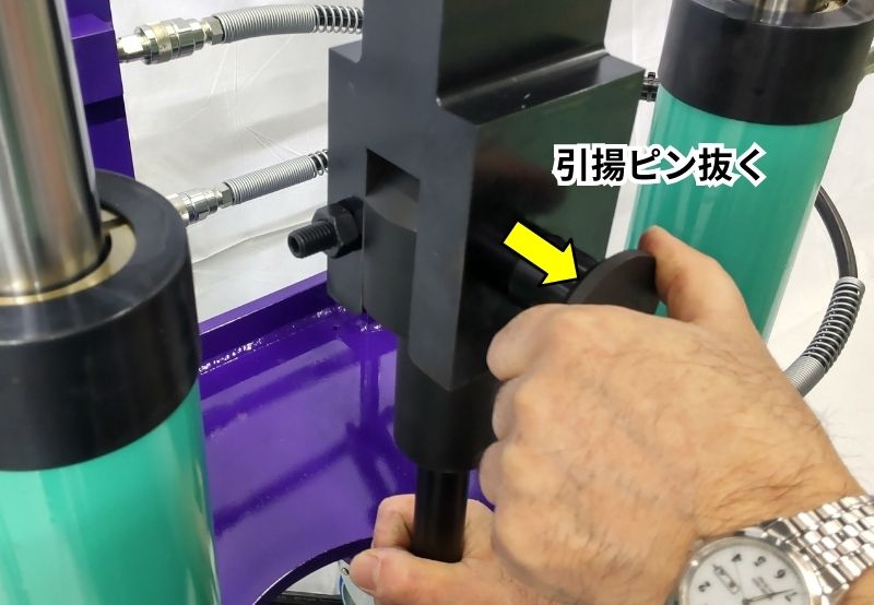 ピン自体に装置重量が掛からないように、少しリフトアップしてから引き抜くこと。